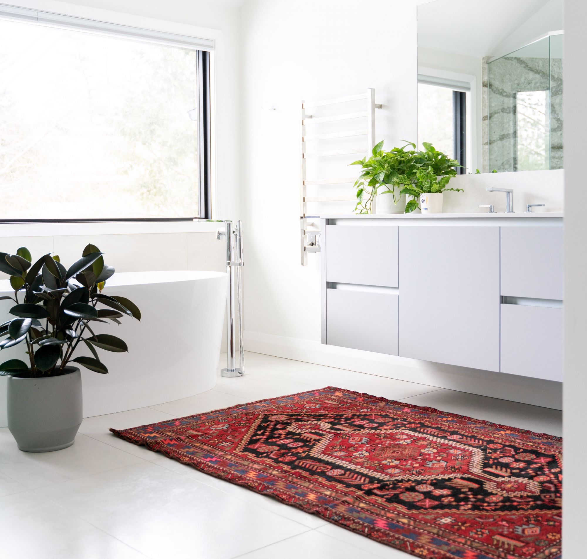 Anche un bagno contemporaneo, arredato con un tappeto vintage, offre risultati inaspettati in un progetto d’interni davvero sensazionale e unico. Un tocco di colore e di tradizione che si tramanda è estremamente utile anche all’interno di una stanza di servizio, che deve risultare, oltreché funzionale e pratica, anche accogliente e ricercata.