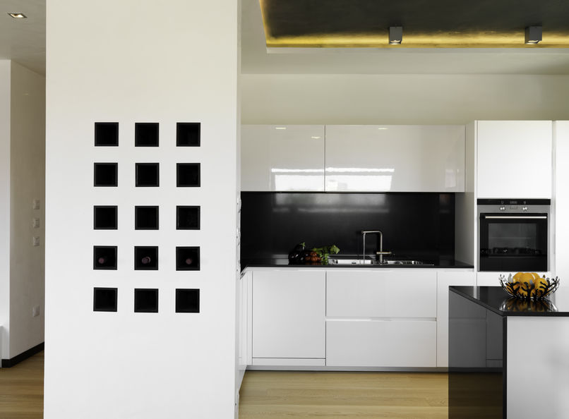 La propria riserva di vino è qualcosa da esibire in cucina, in modo più o meno scenografico. La creazione di un portabottiglie su misura è un’idea che permette di avere un elemento originale ed unico nella propria cucina. Una soluzione minimalista ma di grande effetto è la costruzione di una serie di fori, disegnati seguendo una griglia regolare, ricavati all’interno di una parete. Si tratta sostanzialmente di una sorta di libreria in cartongesso ma con ripiani adeguati a contenere una singola bottiglia. Una tinta a contrasto per le pareti interne del portabottiglie rende ancora più particolare questa soluzione.