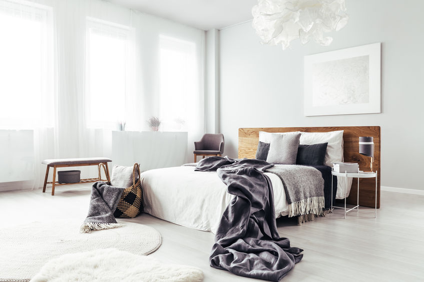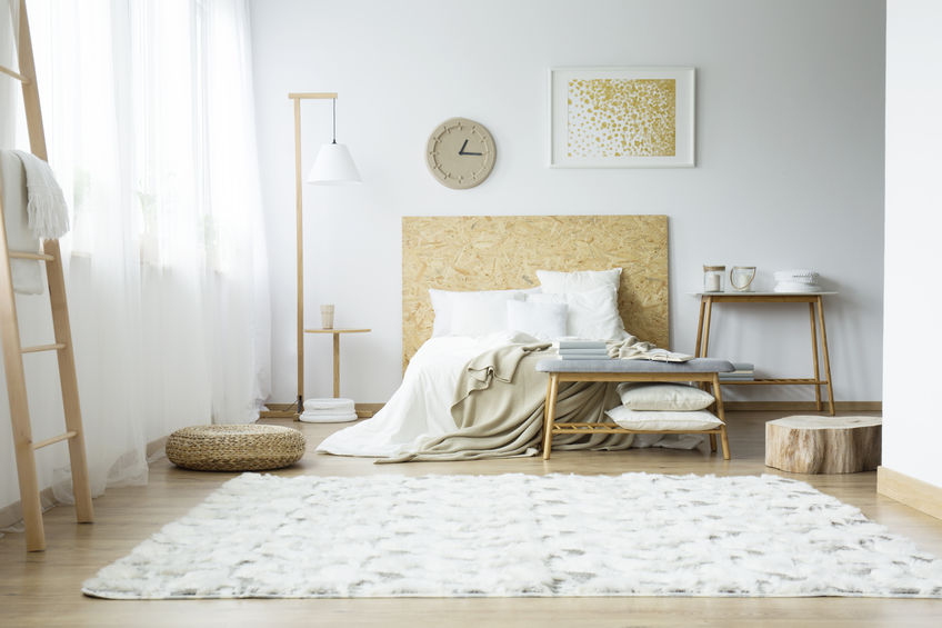 Piccoli tappeti a pelo lungo, solitamente bianchi o in colori neutri, si possono posizionare liberamente per decorare la camera da letto, con l'obiettivo di aggiungere una texture che aiuta a creare una piacevole atmosfera cocooning.