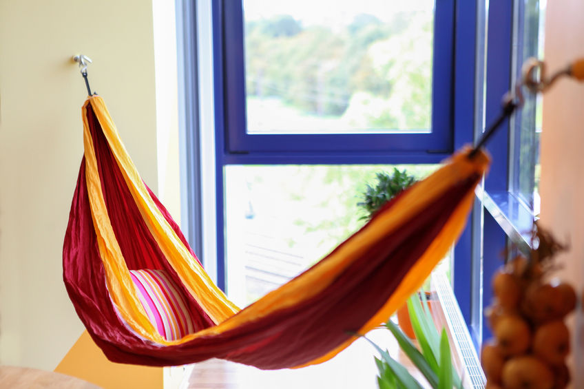 Infine, una soluzione per sospendere l’amaca tra due muri perpendicolari, magari con una vista piacevole sull’esterno. É possibile infatti fissare un’amaca leggera a pareti di cemento o mattoni utilizzando appositi ganci che consentono il movimento oscillatorio.