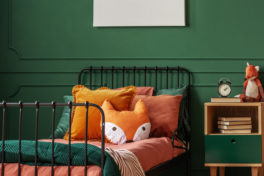 Anche nella cameretta per bambini, una tonalità particolare come il verde bosco può trovare il suo perché. Stile e gusto scandinavo inseriscono questo colore sulle pareti, in parti di arredi e nel tessile da letto. Piccoli trucchi evocano una stanza che ricorda un’epoca leggermente retrò con cornici in legno applicate a muro, set di lenzuola e copri piumini vintage in monocolore e peluche e cuscini che richiamano il tema della volpe che vive nella tipica campagna anglosassone.