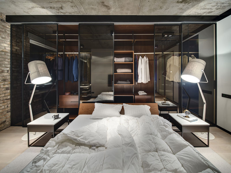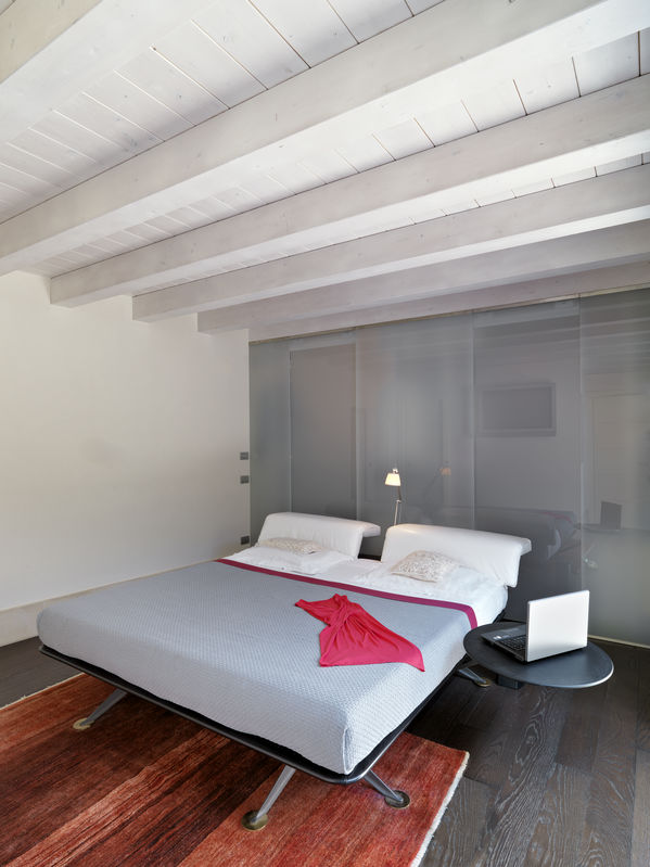Elegante e raffinata l'idea di realizzare una parete vetrata scorrevole alle spalle del letto usata per dividere dalla zona armadio. Grazie alla trasparenza del vetro permette alla luce presente nell'ambiente principale di passare a quello secondario, rendendolo così luminoso ed arioso.