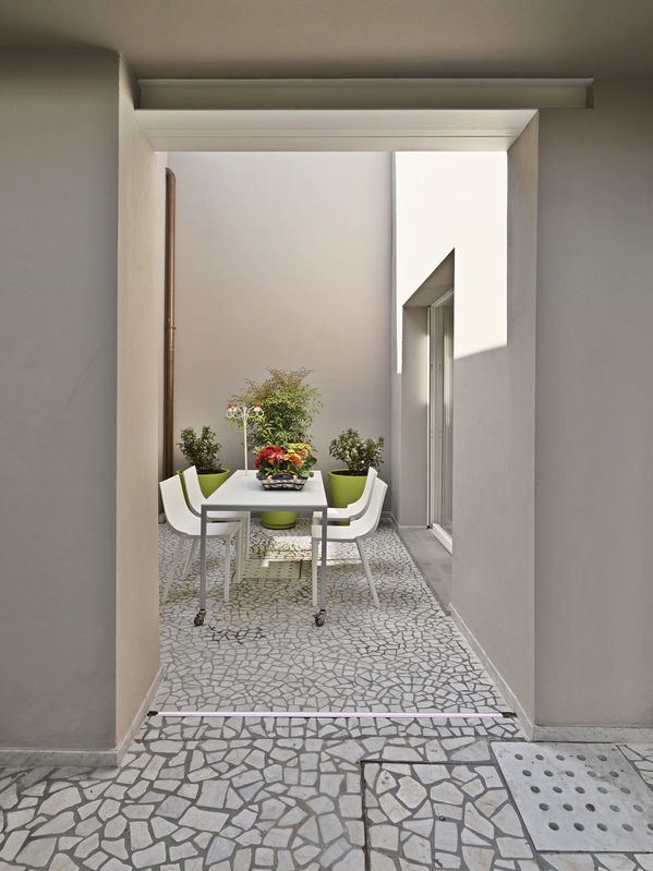 Il non avere una copertura all’interno di queste piccole corti, implica che gli elementi d’arredo debbano essere scelti in materiali molto resistenti agli agenti atmosferici, come il pvc e i suoi derivati, la resina o la plastica riciclata per prodotti eco sostenibili e dai colori neutri.