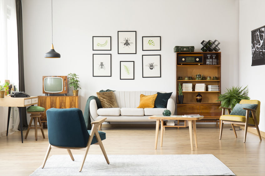 Si può riuscire a dare un’atmosfera vintage anche all’interno di una casa moderna e minimalista se si utilizzano mobili ed accessori in stile. Le linee epurate ed i materiali architettonici delle case attuali possono essere sfruttati come una tela bianca su cui esporre i propri arredi ed oggetti trovati nei mercatini. Questi infatti sono molto riconoscibili ed in un ambiente contemporaneo vengono messi in risalto per contrasto. Una bella radio in legno è un esempio degli accessori che si possono utilizzare per decorare il salotto in stile vintage affiancati a mobili in legno dalle linee tipiche degli anni '60 e 70’.