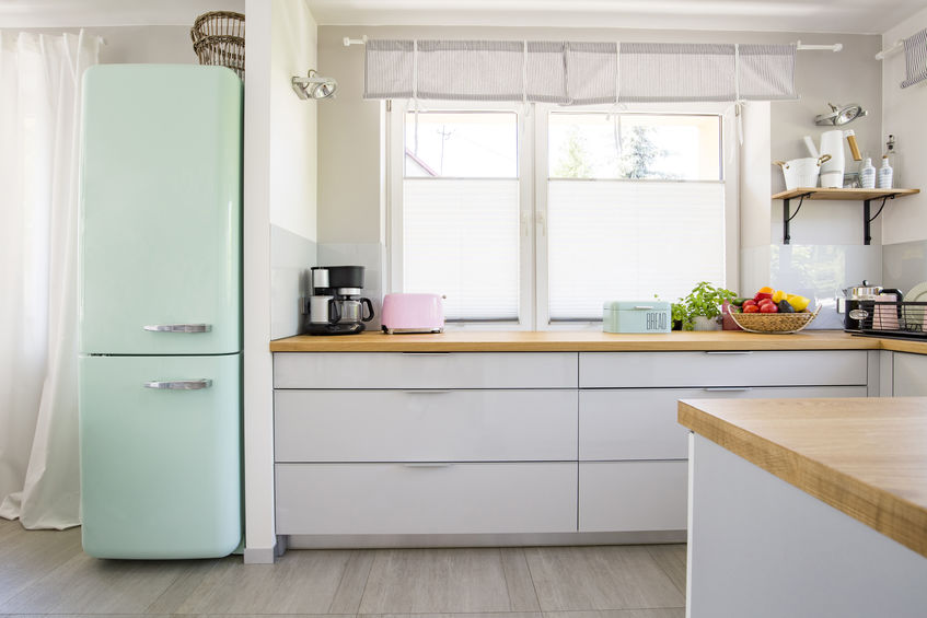 I frigoriferi freestanding in stile vintage, caratterizzati da forme bombate e dettagli cromati, sono disponibili in molte tonalità così da accontentare tutti i gusti. In alternativa si possono applicare delle pellicole colorate per rivestire qualsiasi tipologia di frigorifero, in modo da personalizzarlo.