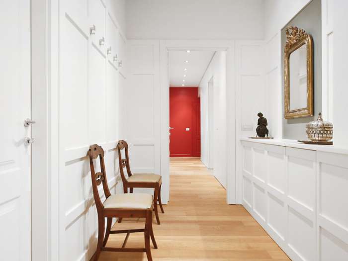 Si può utilizzare la boiserie anche per dare maggiormente carattere ad un determinata zona della casa, magari in entrata, in una parte del soggiorno o anche per risolvere rientranze o nicchie delle pareti che possono diventare spazi utili per mensole, librerie o cassettiere.