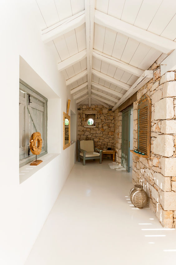 Disposizione e materiali non sono stati toccati. Il rivestimento esterno in pietra è stato mantenuto e pulito alla perfezione e lasciato a vista anche in alcuni punti interni della casa stessa. Le restanti pareti sono state nuovamente intonacate, mentre i soffitti con travi di legno centenarie sono state tinteggiate in bianco per donare più luminosità a tutti gli ambienti. La pavimentazione è quella che ha subito un cambiamento decisamente più radicale.