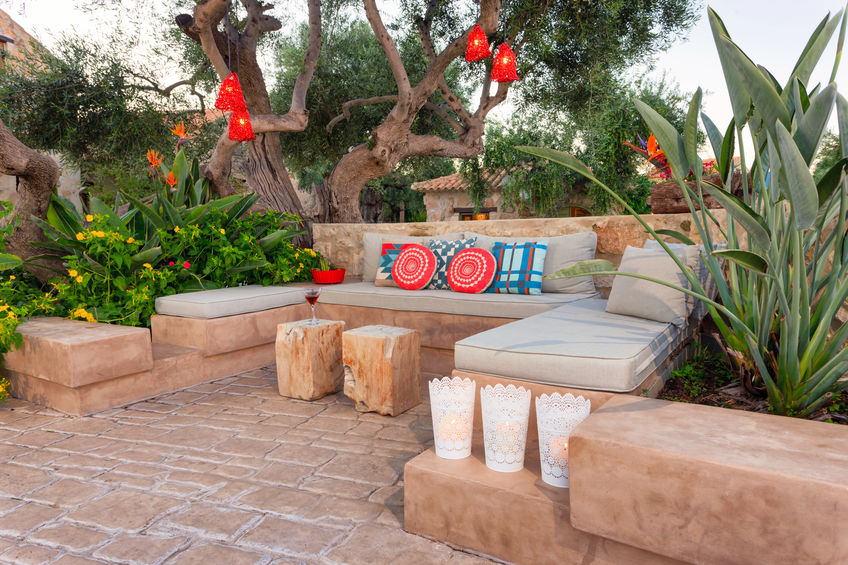 Per evitare insolazioni o sporadici rovesci, dei tendoni di tela ecrù, vanno a costruire il soffitto di questa sala da pranzo unica e irripetibile nel suo genere.
