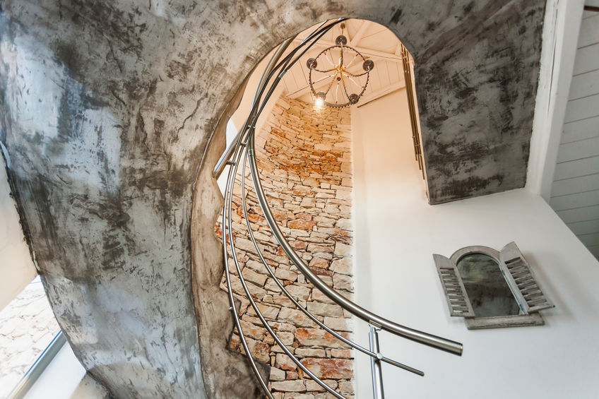 La scala a chiocciola, che collega zona giorno a zona notte, è stata rivestita con del cemento spatolato e circondata da una ringhiera in acciaio lucido.