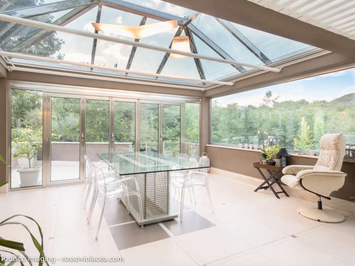 La copertura in vetro pur separando l'interno dall'esterno deve rimanere luminosa e allo stesso tempo garantire il comfort necessario per vivere con il giusto benessere l'ambiente, senza che si verifichino accumuli di calore e uno sgradevole effetto serra in estate. Allo stesso tempo dobbiamo garantire il ricircolo dell'aria grazie alla realizzazione di specifiche aperture.