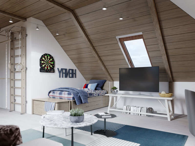 Le mansioni all’interno di una mansarda dedicata ai ragazzi di casa, sono immediatamente riconoscibili ed essenzialmente riguardano l’inserimento di un ampio salotto, una camera da letto minimalista, una zona studio organizzata e un’area per il tempo libero ben attrezzata.