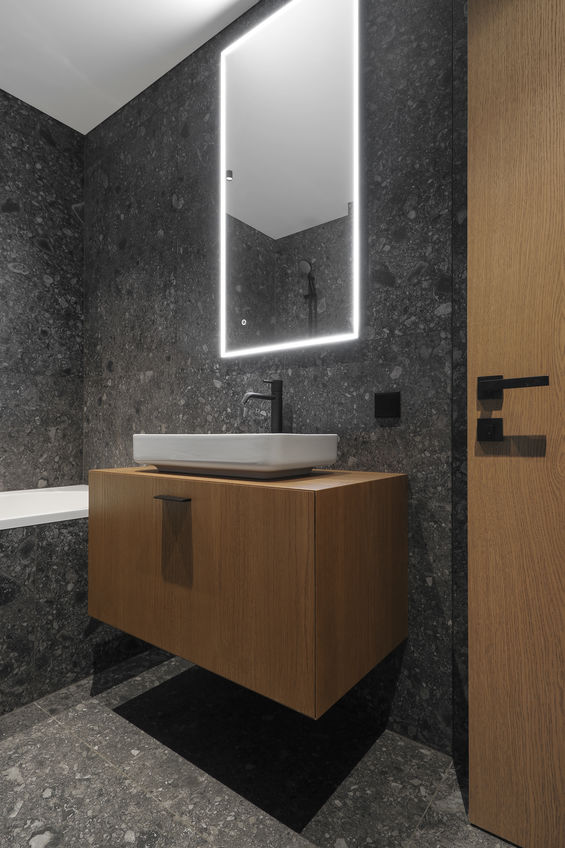 Altro scontro vincente, opaco vs lucido a livello di materiali con la stessa tonalità di fondo, riguarda l’abbinamento di un pavimento in marmo, a top e vasche da bagno in pietra lavica.
