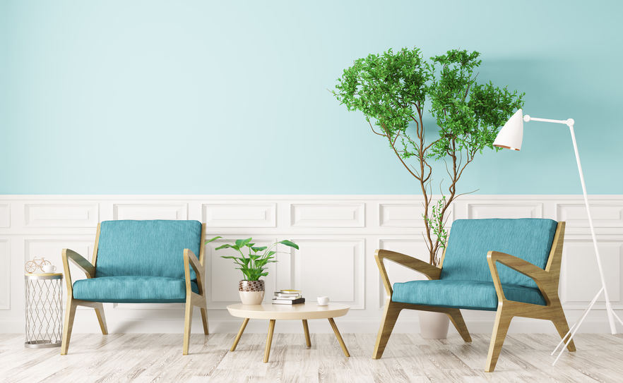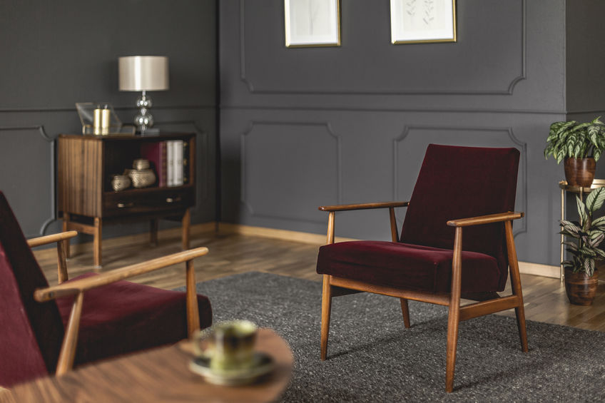 Per aggiungere un tocco rinfrescante in soggiorno si può puntare su delle sedute colorate dal design moderno. Le poltrone con struttura in legno a vista, con forme scolpite ma equilibrate, è tipica del design degli anni '50, mentre l'imbottitura dalle forme bombate apporta il confort necessario. Lo schienale basso e la seduta ampia sono un ulteriore elemento distintivo di questa epoca.