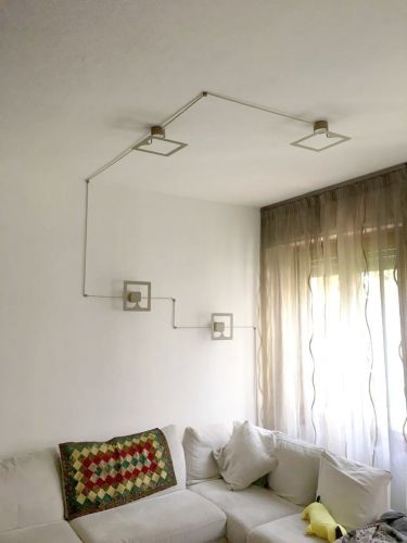 Per questo soggiorno era richiesta un illuminazione generale, diffusa. L'assenza del punto luce a soffitto ha richiesto una soluzione alternativa. Abbiamo fatto quindi comandare una presa di quelle esistenti e creato un percorso con un cavo elettrico decorativo, lungo il quale sono posizionati i corpi illuminanti, sia a parete che a soffitto. In questo modo la luce dall'alto investe l'ambiente in maniera omogenea, mentre i corpi illuminanti a parete, dotati di uno schermo anti abbagliamento, generano un effetto decorativo sulla parete, maggiormente illuminante sul divano sottostante.