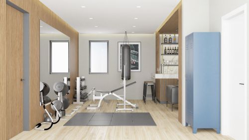 L' ambiente adibito a zona relax e palestra, è ben delimitato nelle sue due funzioni, la parte principale più grande è destinata a palestra, e anticipa un' area relax più privata, dove è presente un angolo bar posto di fronte alla parete che contiene la tv. Il legno, è il materiale utilizzato per definire i due spazi, utilizzato anche nel soffitto della seconda area.