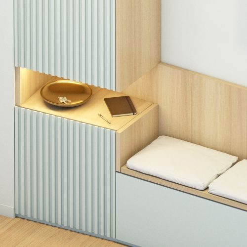 L' ingresso di questo b&b è stato disegnato in chiave contemporanea, riuscendo ad integrare funzione ed estetica. Attraverso dei contenitori o delle pannellature cannettate, sono stati nascosti alcuni elementi come il boiler per l' acqua calda, alcune prese e il quadro elettrico. Appena ci si trova all' interno dello spazio, vi è un pratico ripiano svuota-tasche, che interrompe la linearità di un contenitore a tutta altezza che nasconde il boiler. Successivamente trova spazio una comoda panca rivestita in essenza, conclusa con una fioriera che funge anche da bracciolo della panca stessa. L' ambiente è completato con delle fioriere poste in verticale su di una parete, e una mensola che integra alcune pannellature che nascondono altri elementi tecnici.