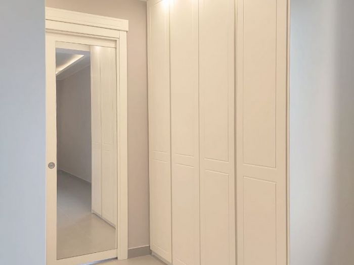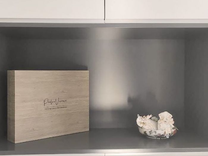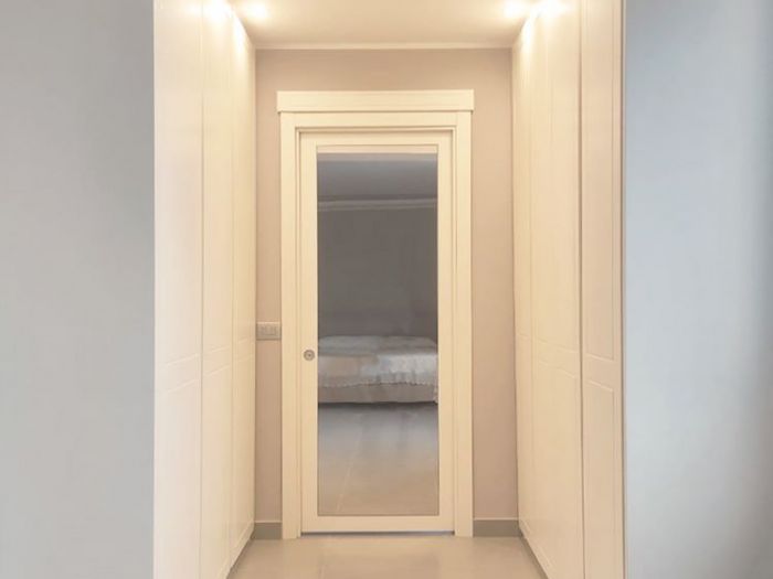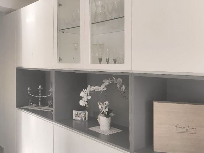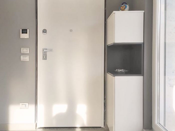 Il progetto di questo appartamento si concentra principalmente nella zona giorno, costituito da un open space che comprende la cucina, la zona pranzo e il soggiorno. La luce, l' elemento principale del progetto, viene riflessa in tutti gli angoli della casa, grazie alle superfii semi lucide degli arredi. Il bianco è interrotto da una sola fascia orizzontale di colore grigio, come alcune pareti, che coinvolge tutti gli arredi. Lo stile minimal e sobrio degli arredi, rispecchia la volontà della committenza di avere un'ambiente libero da aggiunte superflue o ornamenti non necessari.