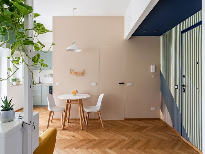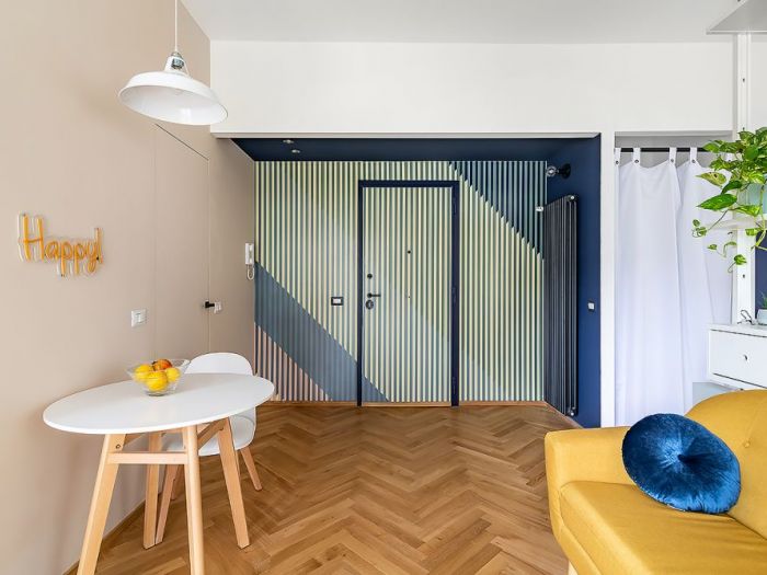 Il progetto di interni si è sviluppato intorno alle abitudini della proprietaria serena, una giovane lavoratrice che aspirava ad una casa dinamica: un rifugio che, seppur concentrato, presentasse una distinzione chiara delle funzioni del vivere quotidiano, con un tocco retrò.