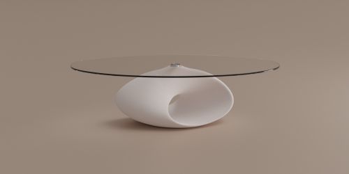 Articolo 124f-4 Tavolino da salotto andromeda Finitura: bianco opaco ral 9010 (superficie ruvida) Misure: cm 120 x 60 Altezza: cm 36 Vetro: ovale – temperato Filo lucido – spessore: cm 1