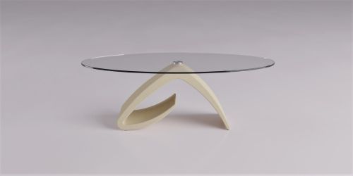 Articolo 817-4 Tavolino da salotto koledo Finitura: bianco opaco ral 9010 ( superficie ruvida ) Misure: cm 130 x 60 Altezza: cm 38 Peso: kg.52 Vetro: ovale – temperato Filo lucido – spessore: cm 1