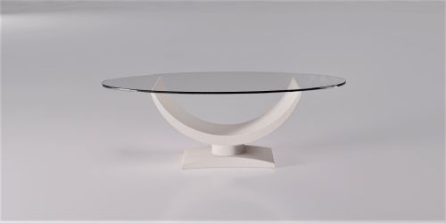 Articolo 41a-4 Tavolino da salotto ruby Finitura: bianco opaco ral 9010 ( superficie ruvida ) Misure: cm 110 x 50 Altezza: cm 46 Peso: kg. 43 Vetro: ovale – temperato Filo lucido – spessore: cm 1