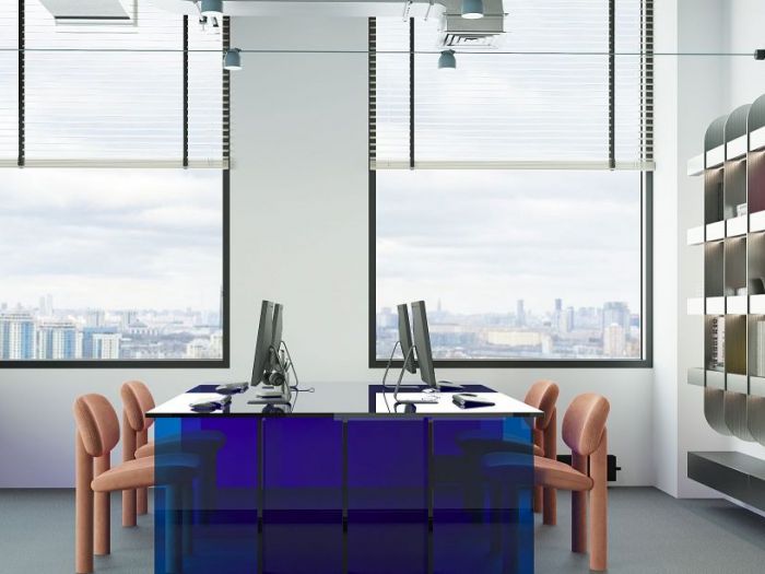 L'area dello showroom corrisponde allo stile moderno, anche negli interni ci sono colori chiari con accenti contrastanti, che sottolineano l'unicità e l'alta funzionalità del prodotto.