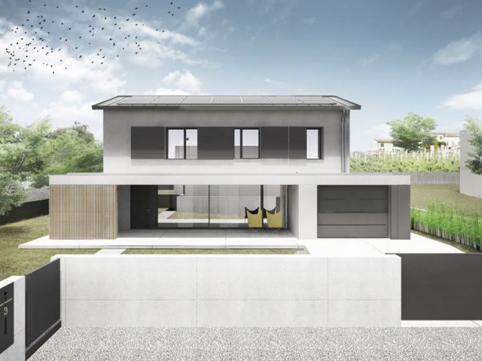 L’interno è composto da una zona giorno open space con ampie vetrate che guardano il giardino privato. La zona notte al piano primo guarda verso il paesaggio collinare circostante attraverso aperture mirate.
