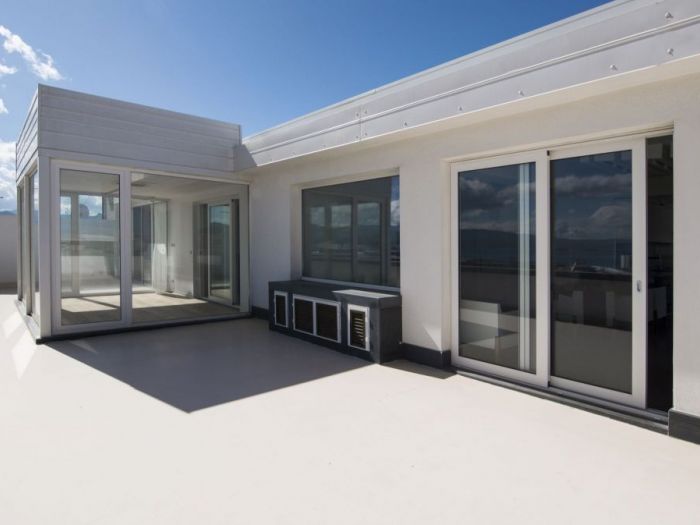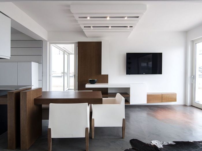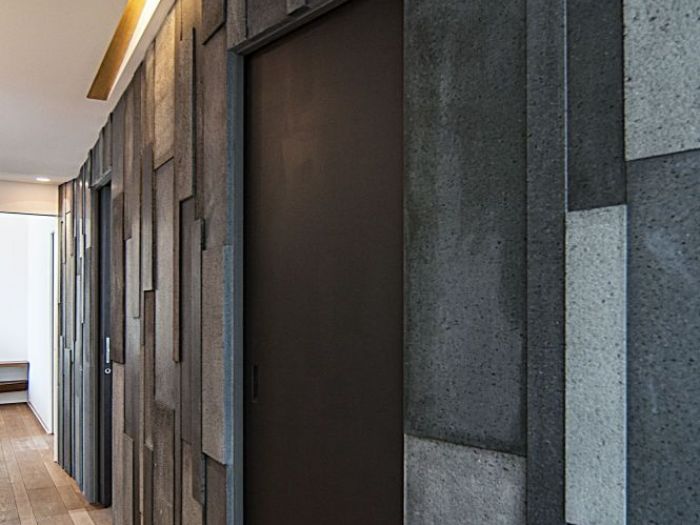 Spazio definito concettualmente da due parti in opposizione. La prima è realizzata con materiali dal forte accento materico, ovvero con un rivestimento in pietra lavica diversamente lavorata; la seconda invece dal forte accento astratto si contrappone ed è contrappuntata da precisi elementi luminosi e trasparenti. La stessa dualità evidente nell'uso delle superfici orizzontali in cui resina e legno determinano l'impianto figurativo della pianta.
