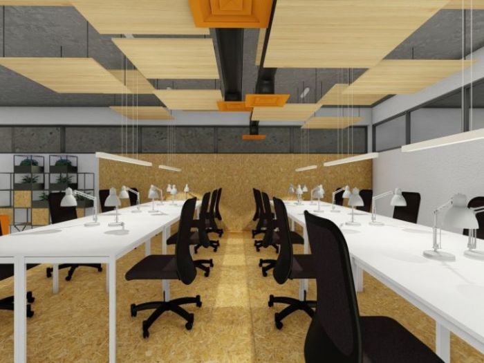 Progetto per il cambio destinazione d'uso di un locale di 300 mq destinati prima a garage ed ora a uffici condivisi (coworking). Spazi funzionali con un immagine incentrata sul recycling e l'industrial.