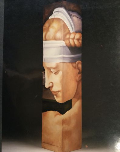 Mobile a colonna (cm30x30xh1.80) contenitore con ripiani, progettato e realizzato, dipinto con colori acrilici e protettivi finali, con riproduzione di un dettaglio della sibilla libica tratto dalla cappella sistina.