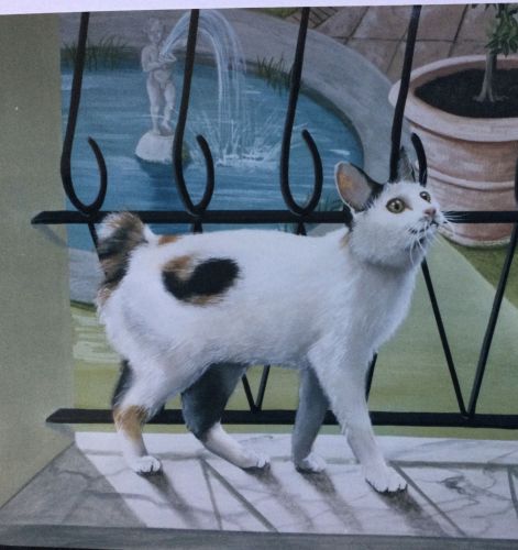 Parete dipinta(m.3x4,5) con veduta, tecnica del,trompe l’oeil, colori a tempera e terre naturali.