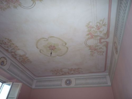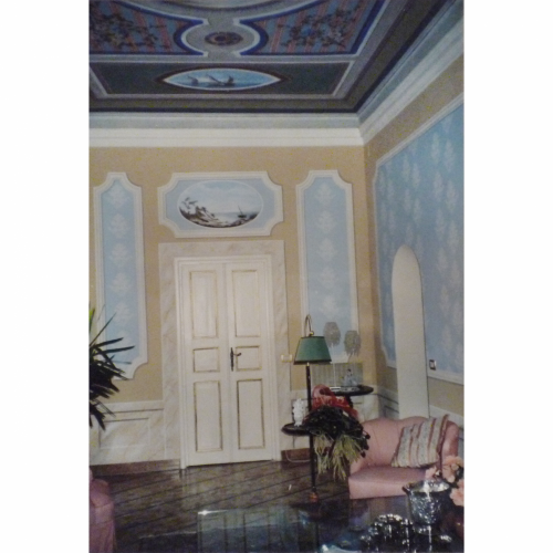 Lavoro di restauro integrale, recupero pitture e riproduzione delle pari mancanti sulle pareti e soffitto della sala di un appartamento all’interno di un palazzo storico