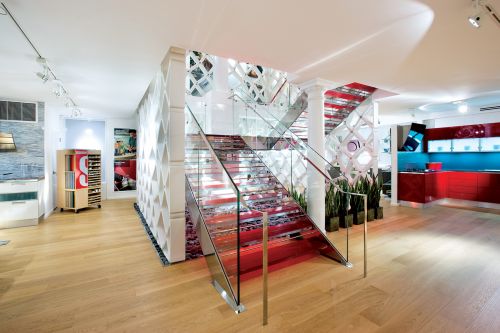 Una scala fontanot, realizzata su misura, unisce i due piani del flaghsip store scavolini a new york. West broadway, civico 429, quartiere di soho: la scala fontanot, progettata dallo studio americano di architettura space architects, unisce due materiali di qualità e tradizione: acciaio e vetro.ogni gradino è composto da quattro strati di 10 mm cadauno di vetro temperato madras uniti tra loro da una pellicola rossa che crea un gioco cromatico di grande effetto visivo. Le ringhiere, anch’esse in vetro temperato, sono corredate da un corrimano in acciaio inox.