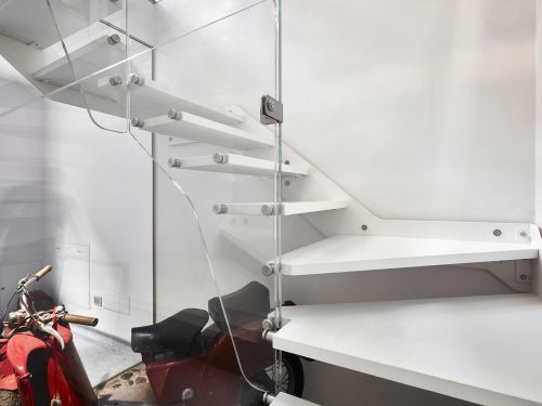 Vista dall’alto della scala che gira a “0” attorno al suo fulcro. La scala speciale ha un’alzata/pedata in lamiera, detta a nastro, ed è a pianta quadrata. Le prime due alzate sono realizzate sempre in lamiera, ma costituiscono un elemento a pedana separato dalla scala che riprende il colore della boiserie in legno sulle pareti perimetrali .realizzazione ex novo di tutta la struttura del soppalco a fianco all’arrivo della scala. Il soppalco ha una struttura in acciaio con pedata mista in vetro (a vista) e in legno (sotto agli armadi). Il soppalco in vetro permette di vedere l’ingresso pur stando seduti nella scrivania al piano di sopra.
