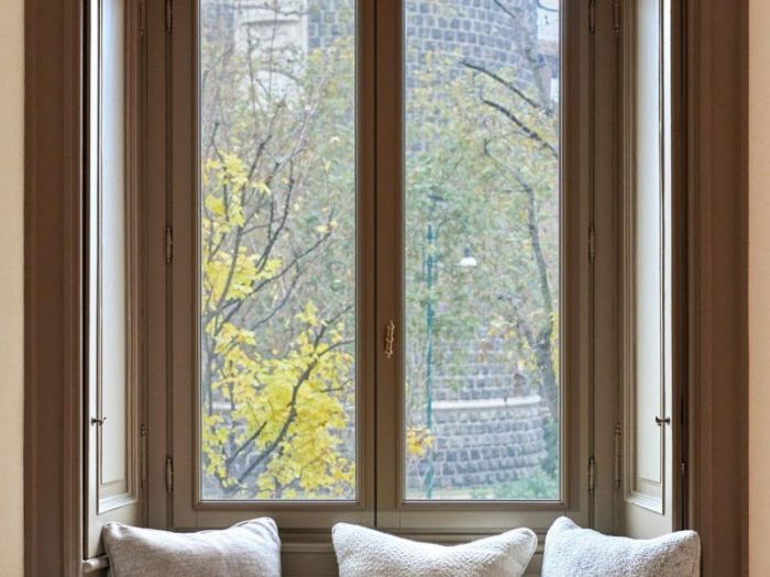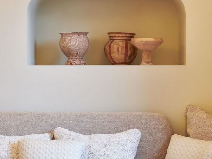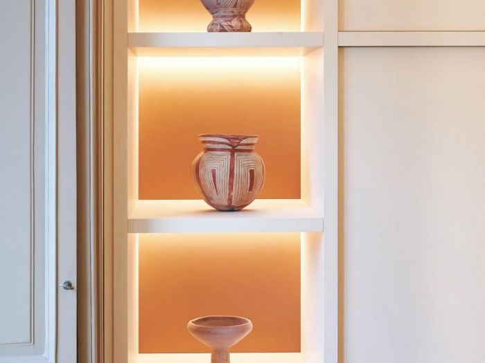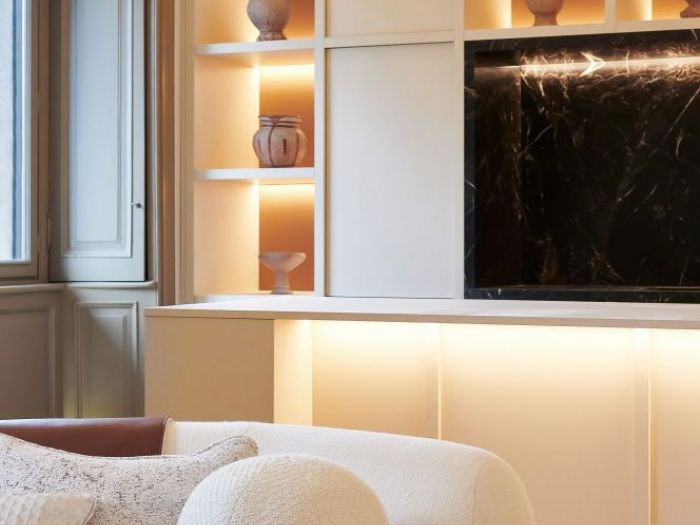 Un pied-à-terre situato in uno storico palazzo nel cuore di milano, in cui tocchi orientali come le anfore antiche, il mobile di ingresso in tessuto e le nicchie in muratura si inseriscono in uno spazio tipicamente milanese che ha come sfondo il castello sforzesco.