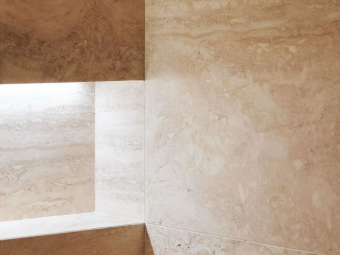 Il bagno principale è completamente rivestito in marmo travertino beige, le cui sfumature e