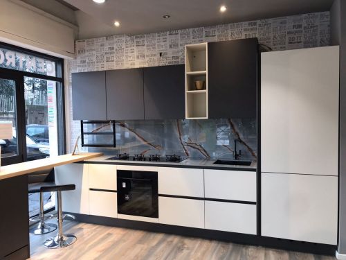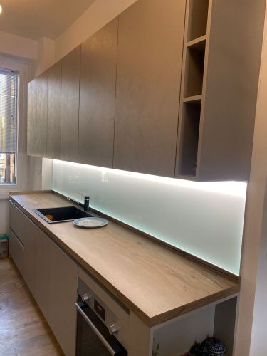 Questa cucina è altamente tecnologica. Potrebbe sembrare che manchi il piano cottura, ma il top matheria honey nasconde al suo interno un piano cottura ad induzione, questo permette di non avere a vista l'elettrodomestico, per una resa finale estremamente moderna e pulita. Inoltre questo escamotage permette di avere un piano di lavoro molto più ampio. Da notare anche la scelta dello schienale, dove è stato progettato un 'paraschizzi' in magnetolab, ovvero un pannello in vetro temperato magnetico e retroilluminato.