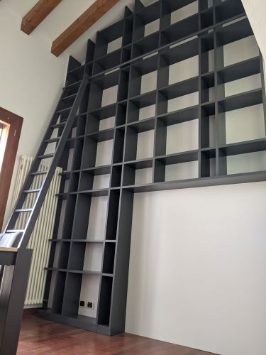 Libreria a tutta altezza in un soggiorno di un attico duplex a doppia altezza con scala e spazio per alloggiare il pianoforte