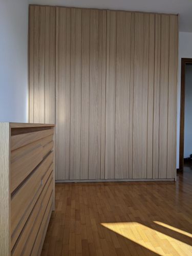 Comodini e cassettiera lavorati in cedro massiccio, con dettagli ad incastro a coda di rondine
