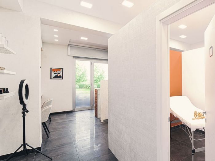 By obtaining two cabins from a pre-existing room and two treatment cabins in a central volume (which does not touch the ceiling) around which the internal distribution takes place and which covers the pedicure area from the entrance.