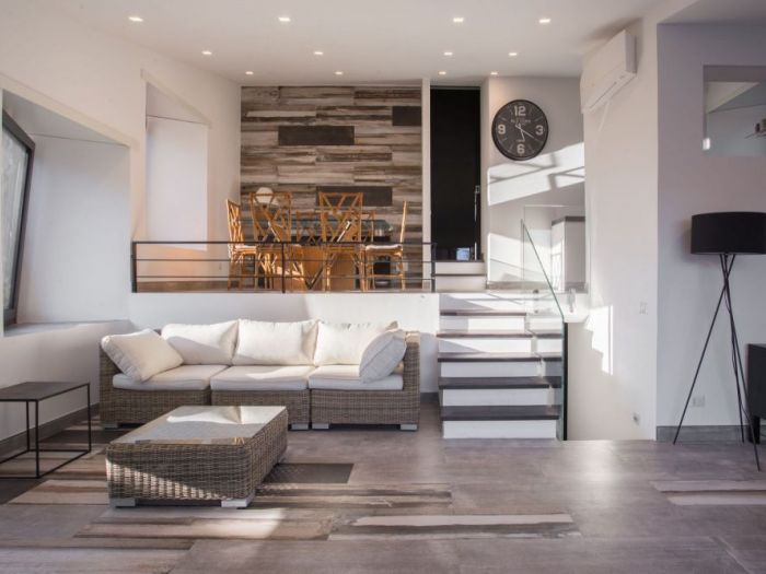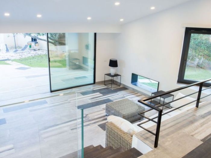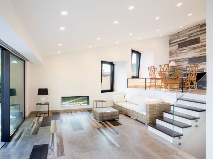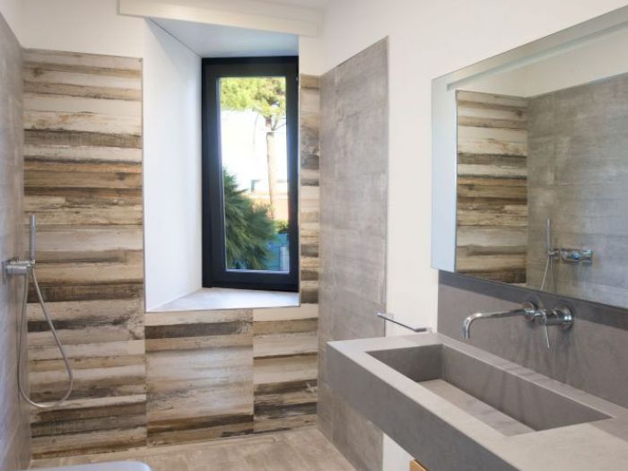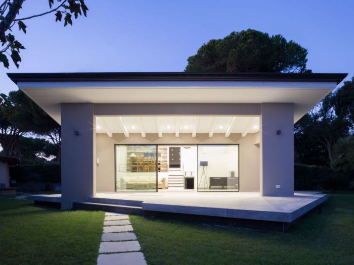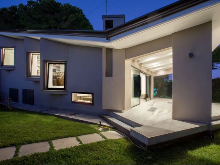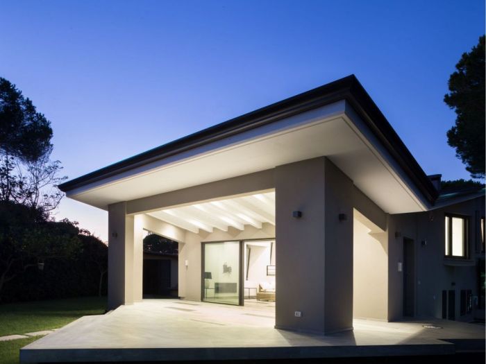 L’immobile in oggetto è un edificio ad uso residenziale situato all’interno di un comprensorio privato. Al piano terra l’edificio si sviluppa su tre livelli: la zona ingresso e soggiorno, la zona cucina e pranzo e la zona notte con due camere da letto e un bagno. Dalla zona giorno si accede al piano seminterrato che ospita anch’esso cucina, soggiorno, due camere da letto e un bagno. L’accesso al piano seminterrato avviene anche dall’esterno tramite un’area pavimentata ribassata. La copertura è costituita da due falde di lunghezza differente poste a “v” con pendenze contrapposte e compluvio. La falda più piccola, sorretta nella parte terminale da due pilastri a l, copre l’area esterna pavimentata di forma irregolare su cui si apre la zona giorno, creando un portico. Sui prospetti laterali le aperture del piano fuori terra, in aggetto rispetto al filo facciata, si dispongono su differenti livelli accompagnando l'inclinazione del tetto. L’intervento riguarda principalmente: la modifica della sagoma dell’area porticata e la ridefinizione del rapporto spaziale tra questa e la zona giorno; alcune modifiche nella distribuzione interna degli ambienti con conseguenti variazioni dei prospetti; l’ampliamento delle falde di copertura e la realizzazione di una pensilina sul fronte sud dell’edificio. Al piano terra il progetto prevede la trasformazione del soggiorno in unico grande ambiente, attraverso la demolizione del muro che attualmente lo divide dall’ingresso. Le due porte finestra esistenti sono state sostituite da un’unica grande vetrata scorrevole che occupa quasi interamente la lunghezza della facciata, aumentando la permeabilità tra l’interno e l’esterno. La sagoma dell’area pavimentata esterna è stata riportata a quella di un quadrato regolare che si innesta nell'edificio in modo asimmetrico. L’interno e l’esterno portati alla stessa quota e trattati con la stessa pavimentazione in modo da creare continuità visiva. La pavimentazione in gres porcellanato di grande formato con effetto pietra. Per quanto riguarda le modifiche interne, è stato ricavato un nuovo bagno tra le due camere da letto dotato di una piccola finestra aperta in copertura. E’ stato spostato il tramezzo che separa la camera dalla zona pranzo in modo da consentire una maggiore fruibilità della camera. Per quanto riguarda la modifica della copertura, l’intervento prevede l’ampliamento laterale delle due falde del tetto, per un’ampiezza pari a 0. 90 m per lato, tale da arrivare a coprire anche le finestre aggettanti e proteggere meglio le facciate dagli agenti atmosferici.
