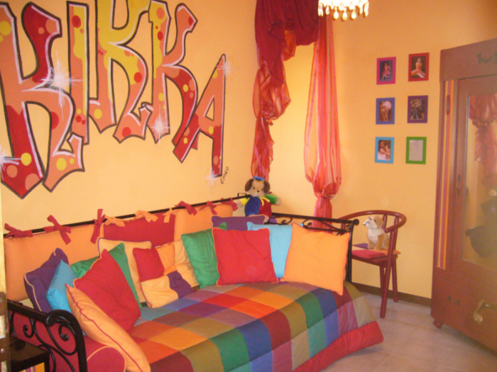 Al piano superiore ci sono la camera della figlia e quella padronale; la prima si rifà allo stile romantico del patchwork rivisitato in modo fresco e divertente e introduce una nota di modernità con il graffito sulla parete; la seconda, invece, con l’ausilio della carta da parati e dei tessuti, ci trasporta in un luogo in cui domina il colore del cielo che irrompe tra colonne ricoperte di fiori rampicanti. Romantico è lo stile e ricorda le case di campagna inglesi.