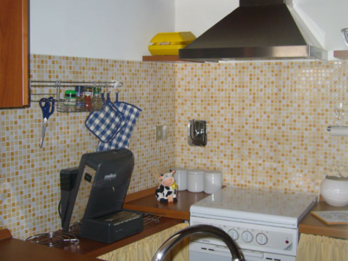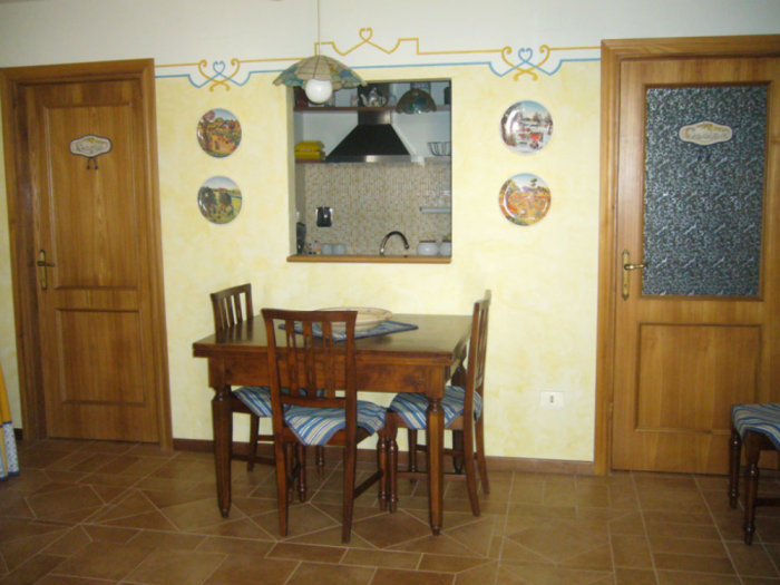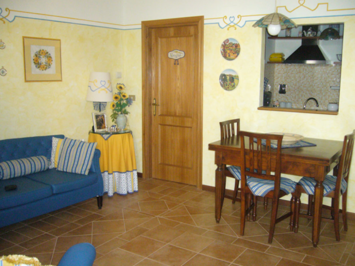 Al piano terra il disimpegno è stato trasformato in una piccola, ma funzionale cucina, destinando, così l’unico grande ambiente a zona salotto pranzo. Qui il giallo, il bianco e i toni dell’azzurro si miscelano nel decoro alle pareti, nelle tappezzerie, nei paralumi, nei fiori, nelle ceramiche…