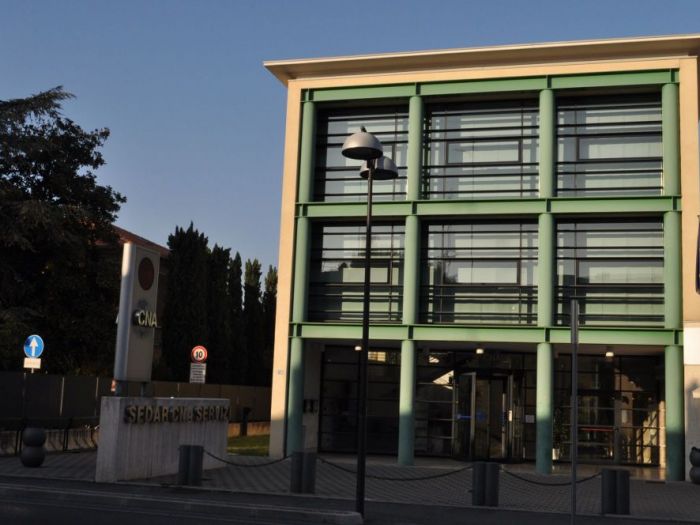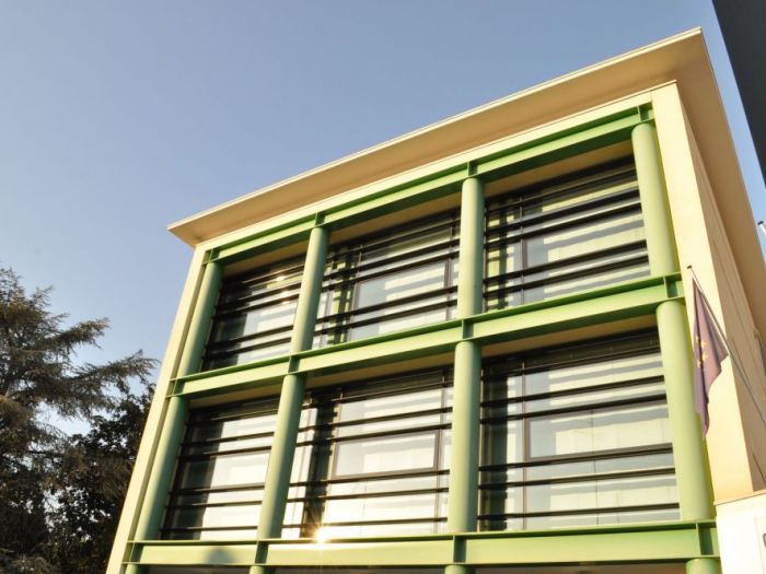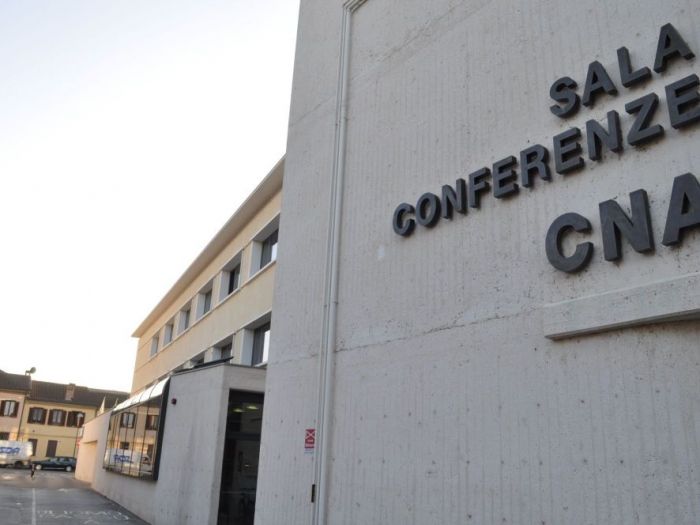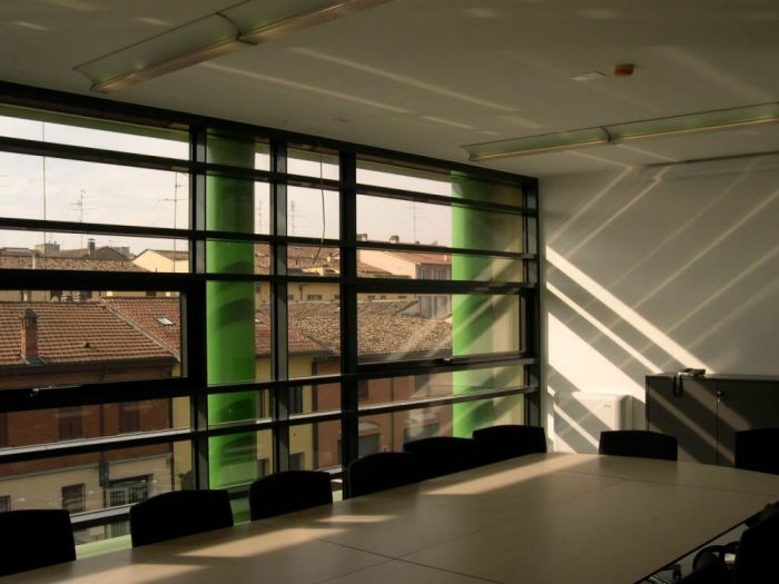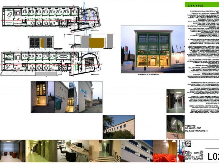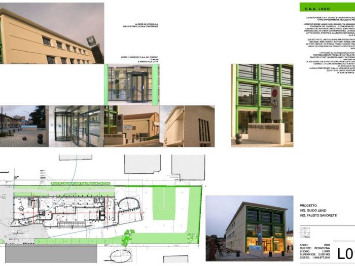 Progetto per la sede uffici cna in via acquacalda 37 a lugo. Materiali solidi e preziosi, linee nette ed essenziali per una piccola sede che presenta ancora oggi validi temi simbolici di architettura.