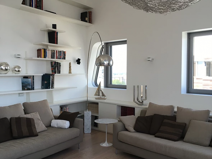 Nel cuore del nuovo intervento di riqualificazione urbana , all'ultimo piano delle residenze progettate dall'architetto "regina delle curve" zaha hadid , abbiamo progettato un moderno attico dalle finiture di pregio e dall'arredo contemporaneo e accattivante.